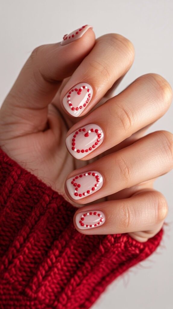 Soft nude short almond nails featuring delicate red-and-white beaded heart outlines — sweet, precise, and full of handmade charm. The glossy finish enhances the texture, while the compact shape ensures comfort for real life. Like tiny candy jewels stitched onto your fingertips.
