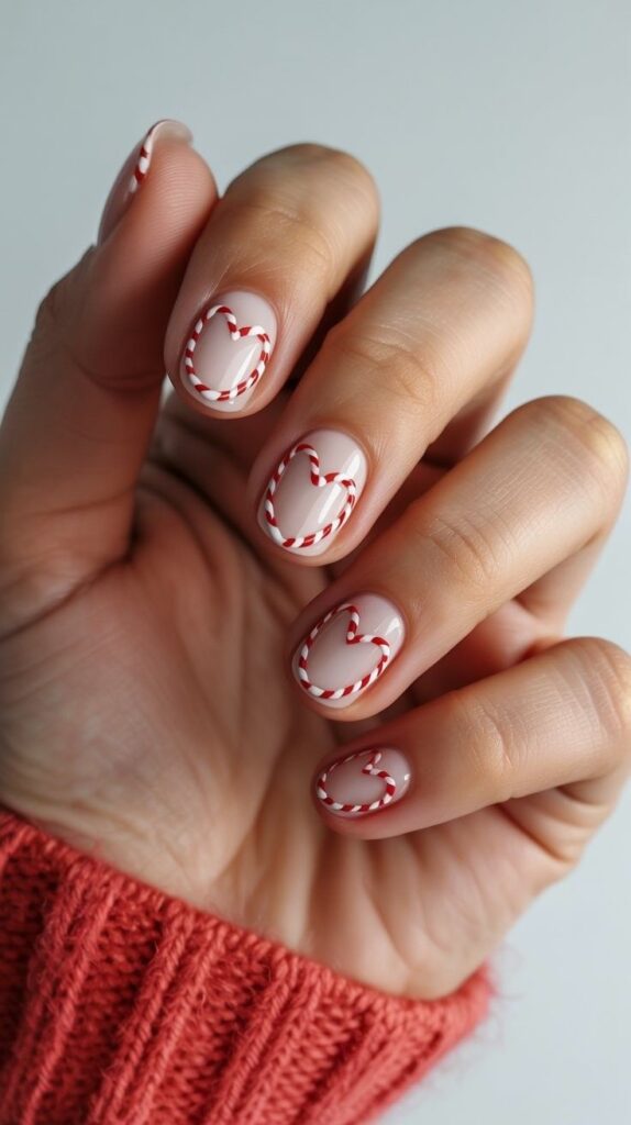 Soft nude short almond nails adorned with delicate red-and-white striped heart outlines — sweet, clean, and full of retro charm. The glossy finish makes the stripes pop like real candy wrappers, while the compact shape ensures comfort for daily wear. Love, wrapped in nostalgia.