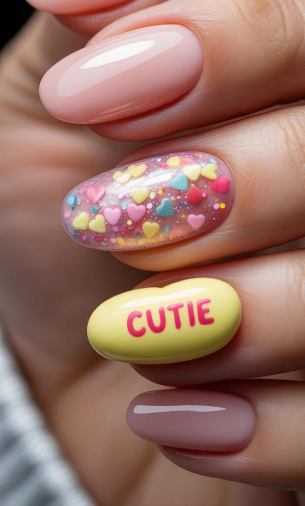 Sheer nude short oval nails topped with a dazzling mix of mini pastel hearts, iridescent dots, and multicolor glitter — joyful, chaotic, and utterly celebratory. One accent nail features a bold yellow 3D heart stamped “CUTIE” in pink. The high-shine finish makes it sparkle like a shaken snow globe. Pure, unfiltered delight.