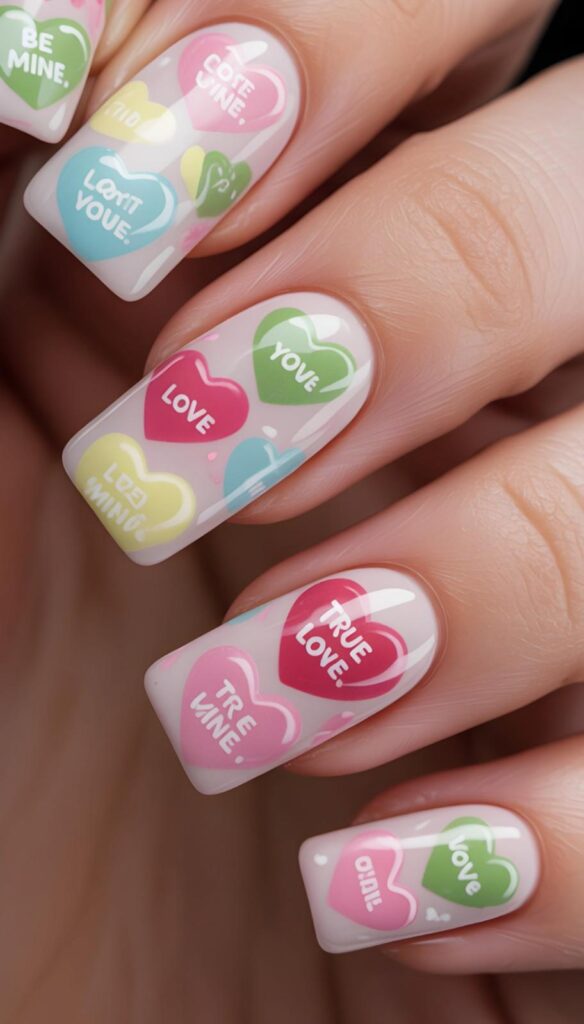 Sheer nude short oval nails covered in overlapping 3D candy hearts in pink, mint, yellow, and blue — each stamped with phrases like “TRUE LOVE”, “LOVE YOU”, and “BE MINE”. The layered effect feels lush and celebratory, while the glossy finish unifies the chaos into harmony. Love, in full confetti mode.