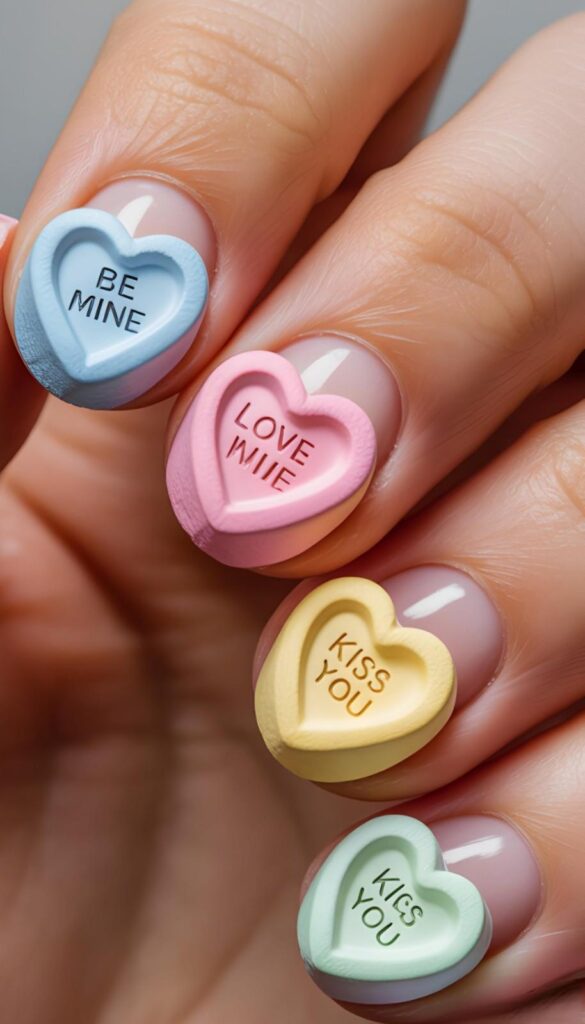 Nude base short squoval nails featuring oversized 3D candy hearts in pastel blue, pink, yellow, and mint — each stamped with classic phrases like “BE MINE”, “LOVE WIE”, and “KISS YOU”. Playful, bold, and deeply charming. The matte-gloss contrast adds realism, and the short shape ensures wearability.