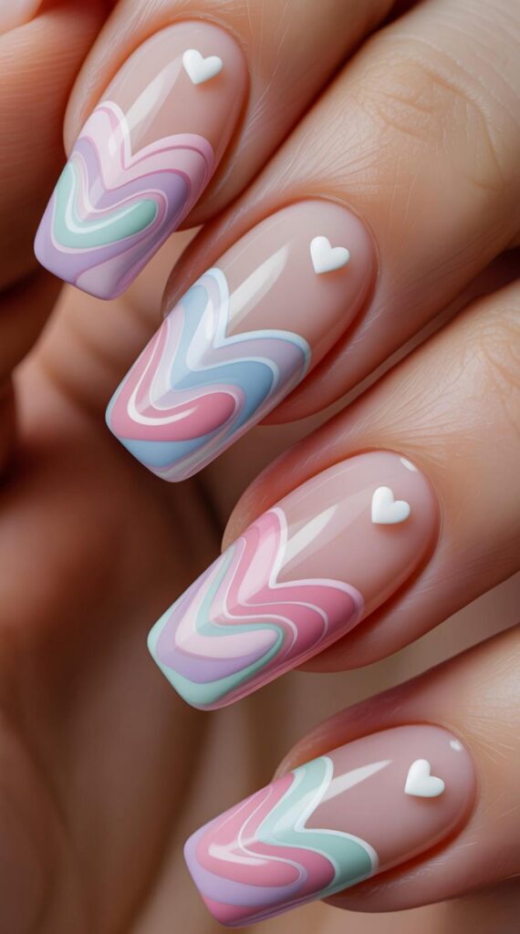 Glossy nude short coffin nails decorated with fluid pastel swirls (lavender, mint, pink, peach) and tiny white 3D hearts — dreamy, artistic, and full of movement. The high-shine finish enhances the liquid-like effect, and the compact shape keeps it wearable. Like love painted in watercolor and sealed with sugar.