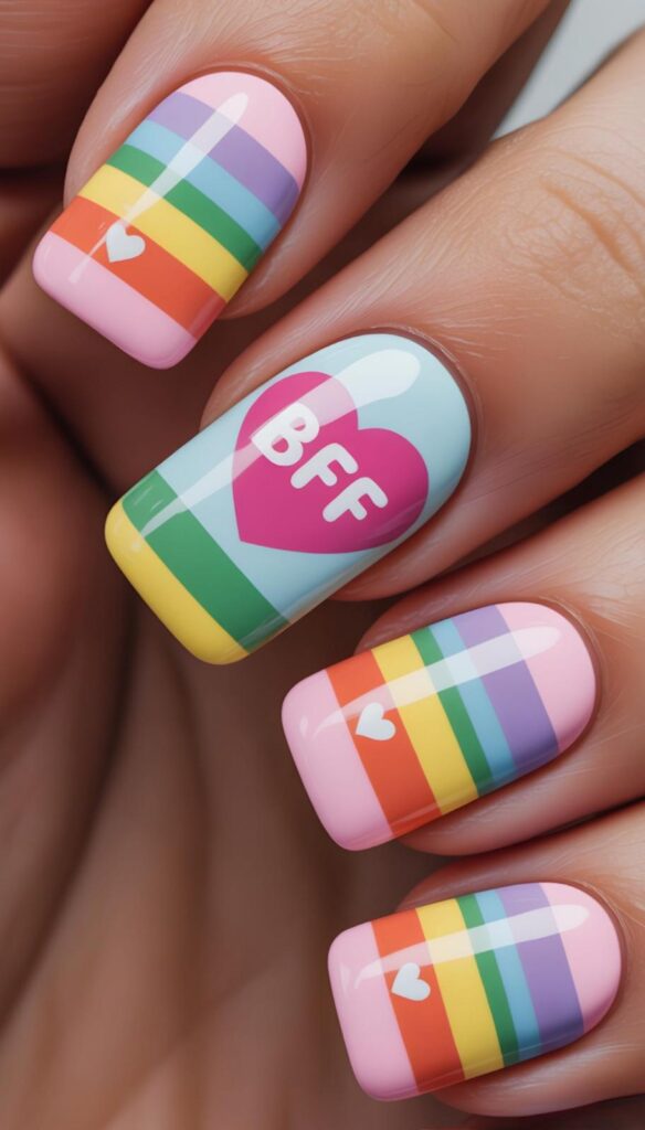 Glossy short squoval nails in vibrant rainbow stripes (red, orange, yellow, green, blue, purple) with a single accent nail featuring a bold pink heart stamped “BFF” — energetic, inclusive, and full of pride-inspired joy. The crisp lines and glossy finish make it pop, while the compact shape ensures comfort for daily life. Love isn’t just romantic—it’s chosen.