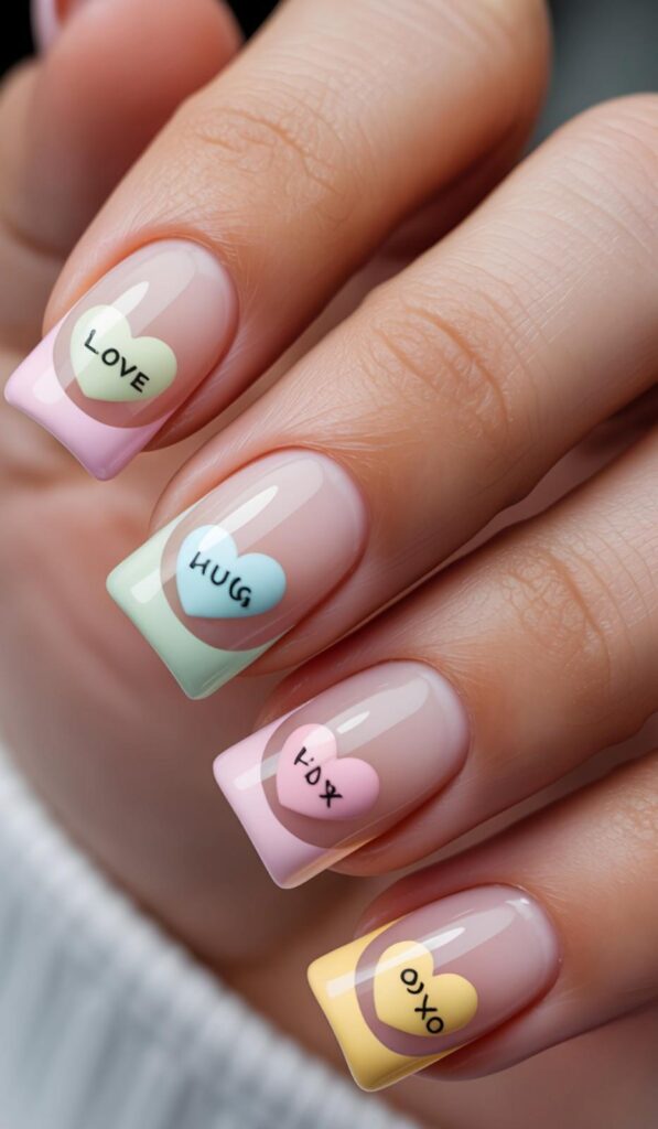 Nude base with soft pink, mint, and lilac French tips — each featuring a 3D candy heart stamped with “LOVE”, “HUG”, or “XOX”. The matte-gloss contrast adds realism, and the short rounded-square shape frames the hand with tenderness. A classic twist on timeless romance.