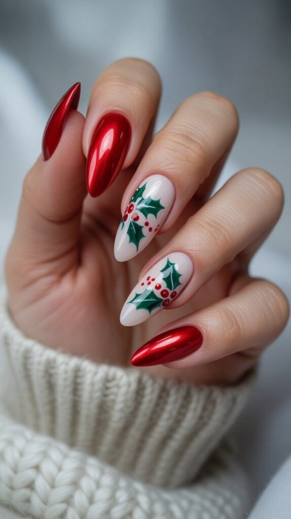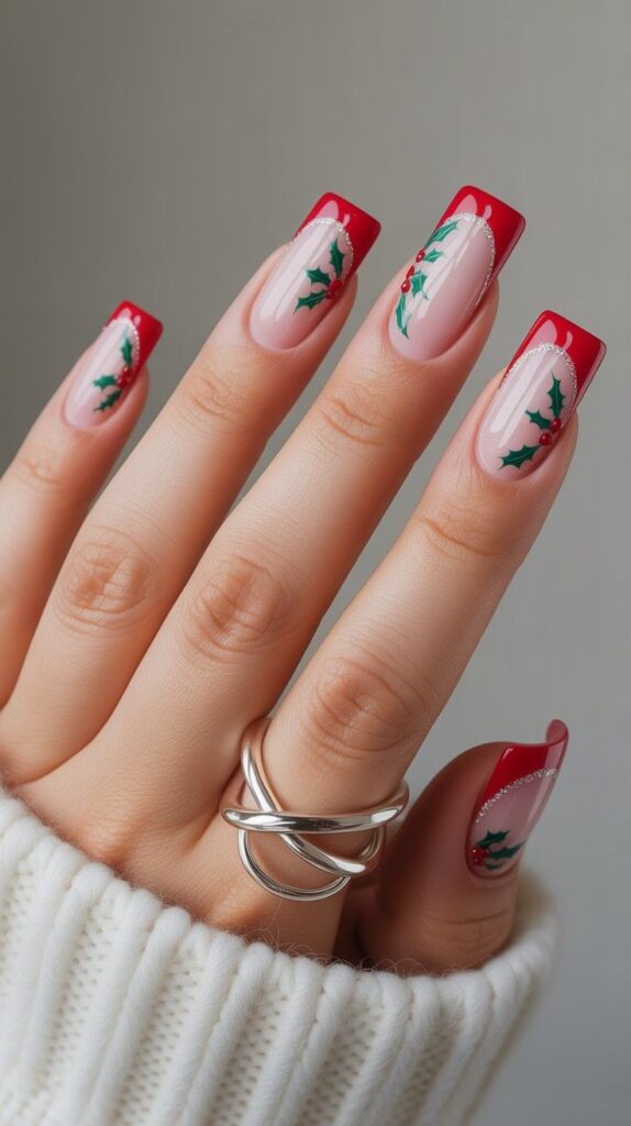“Glossy red polish frames crisp white tips on four nails, while the ring finger steals the show with a giant holly leaf and red berries. It’s bold, cheerful, and totally Instagram-worthy — like wearing a holiday sweater on your nails.”