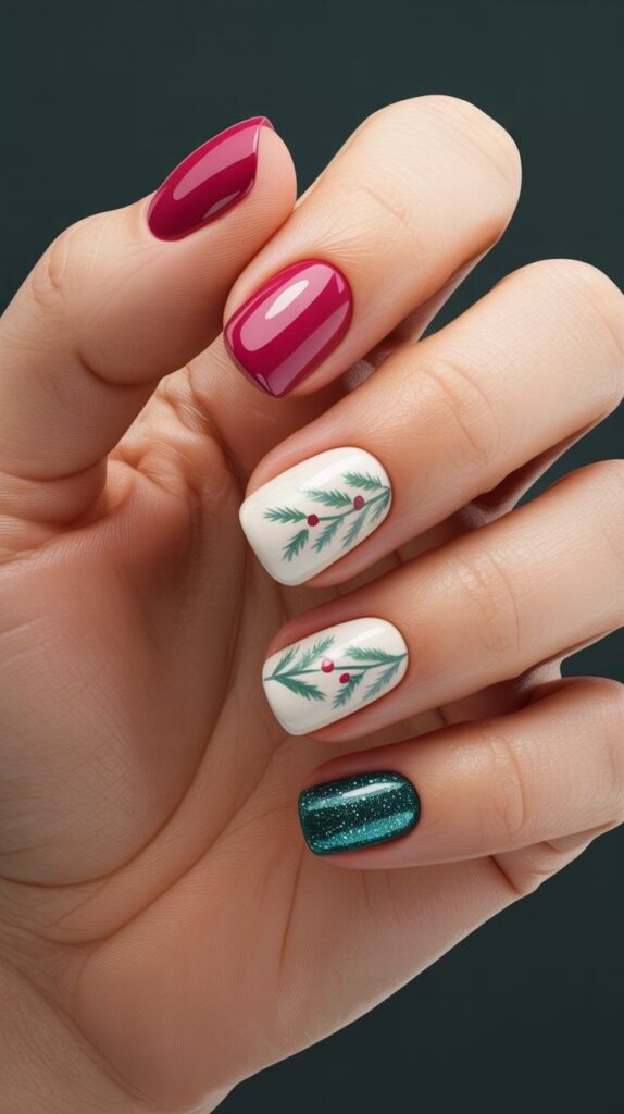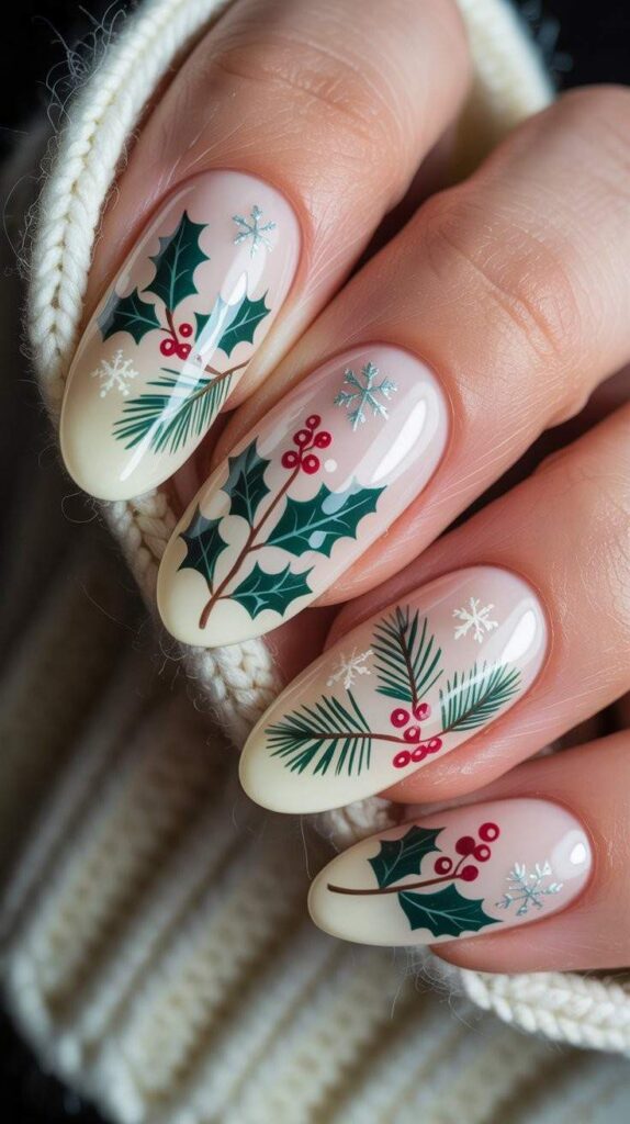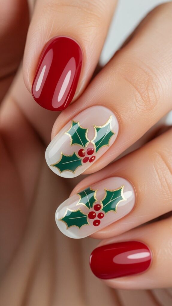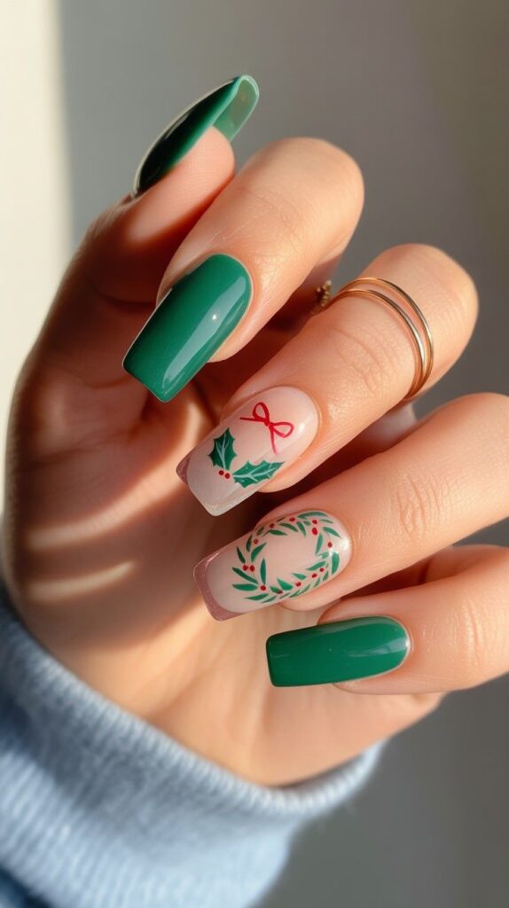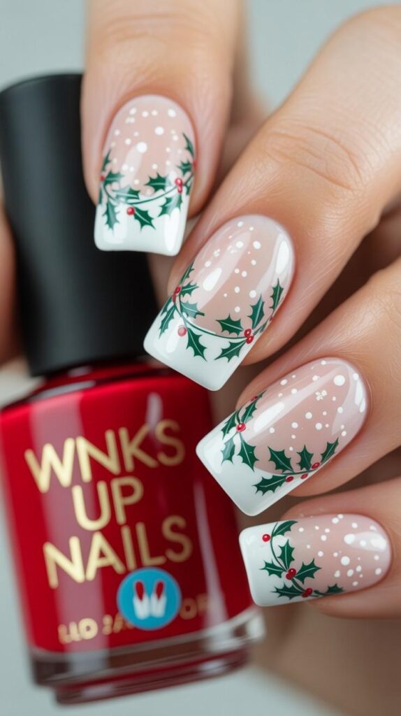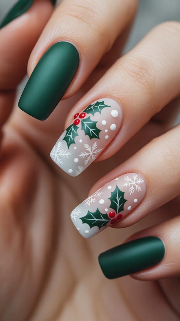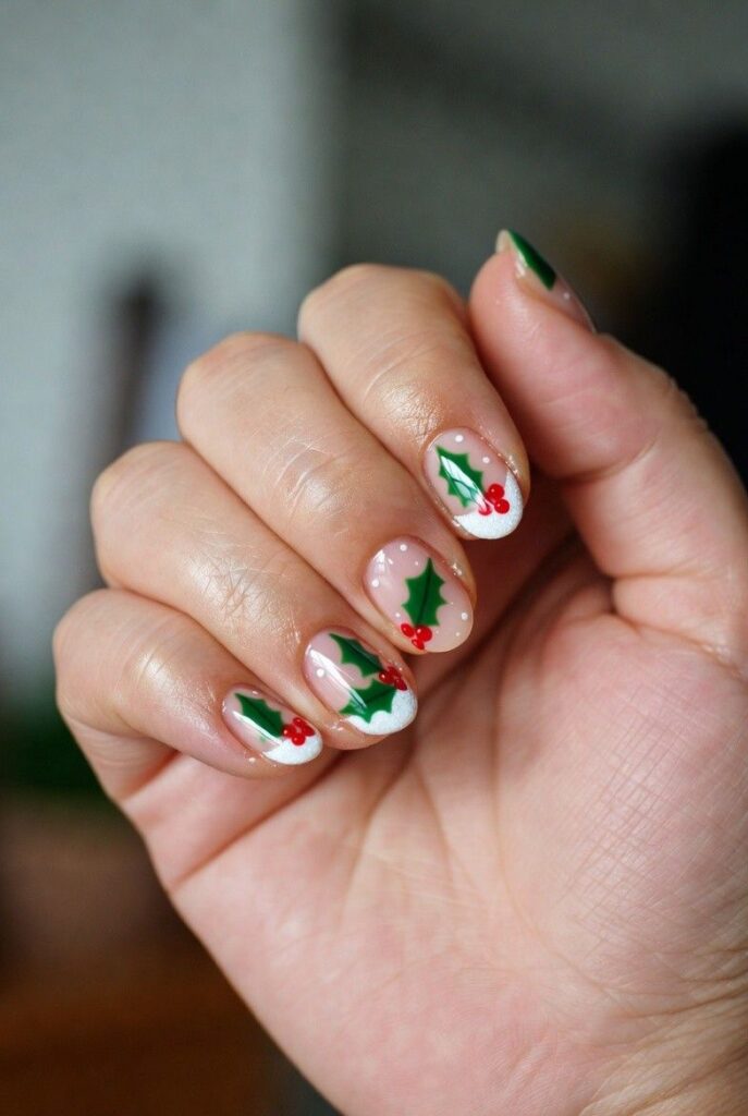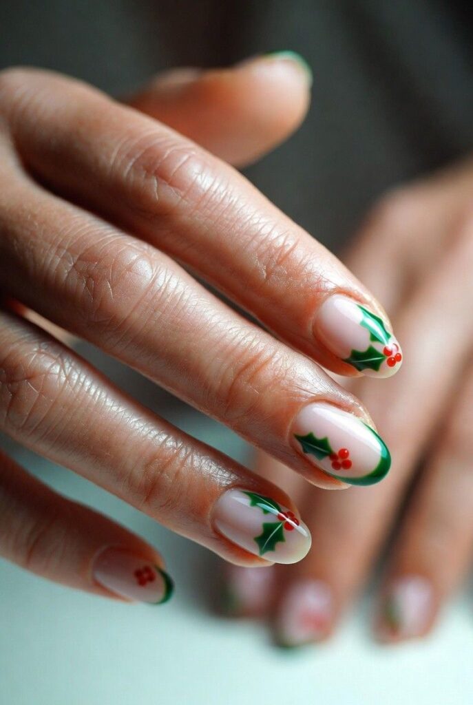“Soft nude polish frames crisp green tips on four nails, while the ring finger steals the show with a giant holly leaf and red berries. It’s clean, elegant, and totally photo-ready — like wearing a winter art exhibit on your fingertips.”
