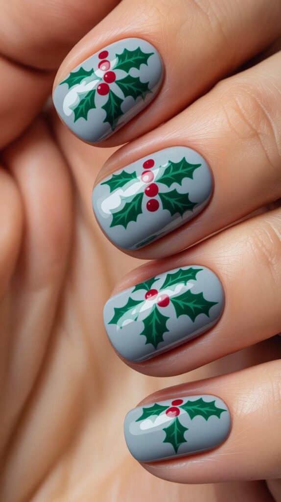 “Crisp grey polish frames delicate green holly leaves and red berries on each nail — simple, elegant, and totally wearable. It’s like wearing a winter fairy tale on your fingertips — sweet, serene, and perfect for everyday wear.”