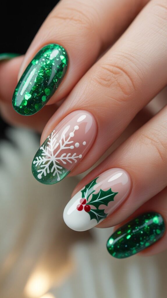 “Glossy green glitter polish frames crisp white tips on four nails, while the ring finger steals the show with a giant holly leaf and red berries. Another nail features a delicate white snowflake — sweet, serene, and totally wearable.”