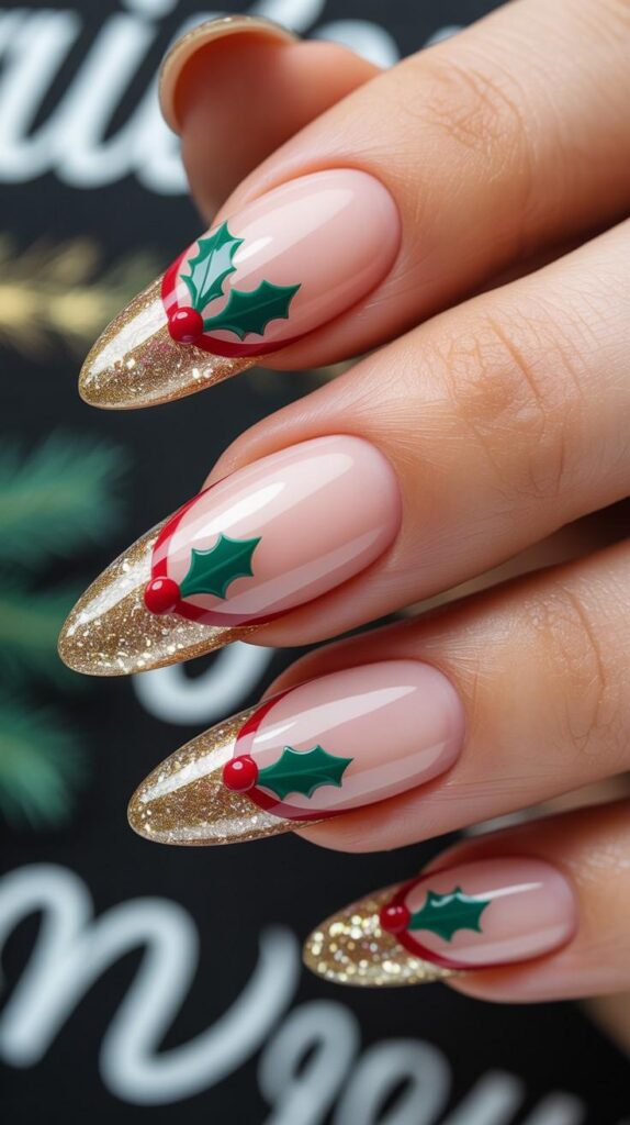 “Soft nude polish frames delicate green holly leaves and red berries on each nail, while one finger gets a glittery gold accent that sparkles like fresh snow. It’s clean, elegant, and totally photo-ready — like wearing a winter art exhibit on your fingertips.”