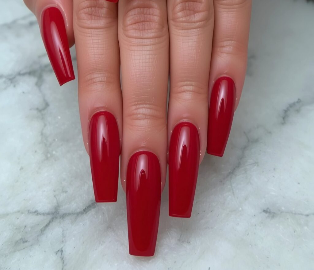 A vibrant red base features a high-shine finish that enhances the bold, dramatic tone. The clean look adds a timeless, powerful charm to the compact shape.