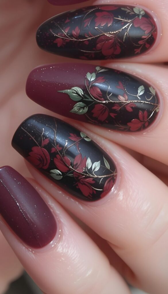 A mix of black and burgundy bases features red floral patterns and gold accents. The intricate details add a dramatic, romantic flair to the dark palette.