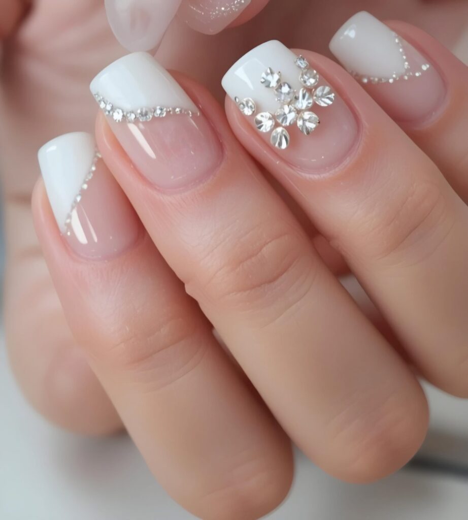 A soft pink base features white tips and one accent nail with rhinestones in a floral pattern. The sparkling details add a festive, radiant charm to the classic design.