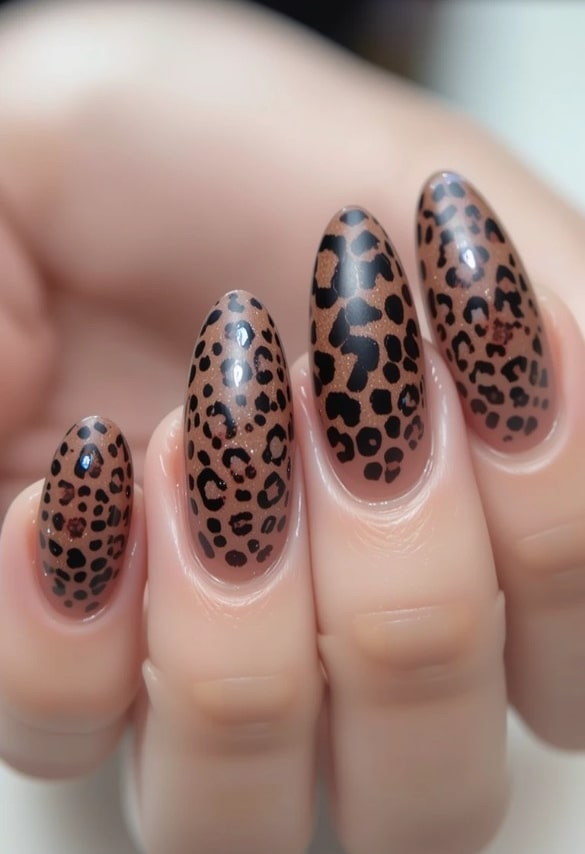 A warm brown base features black leopard print on each nail. The bold pattern adds a confident, fashion-forward flair to the sleek finish.