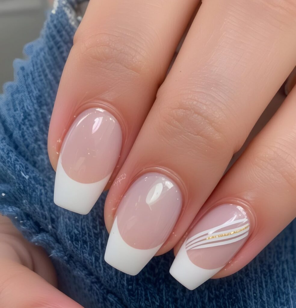 A soft pink base features white tips and one accent nail with gold stripes. The subtle detail adds a luxurious, elegant touch to the classic look.