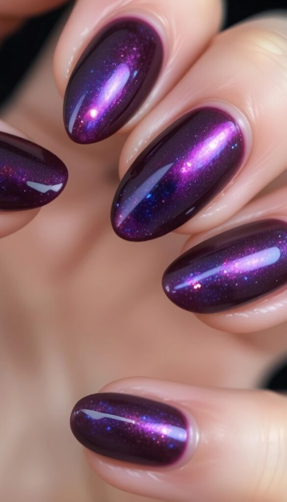 A deep purple base features a holographic shimmer that catches the light. The iridescent effect adds a magical, futuristic flair to the clean shape.