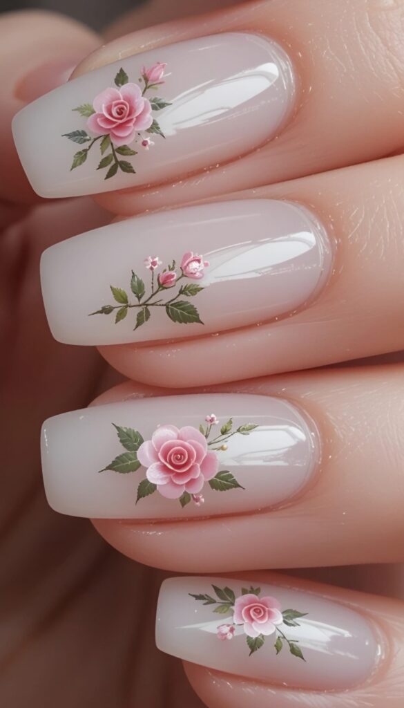 A soft nude base features delicate pink roses and green leaves on each nail. The floral details add a romantic, feminine charm to the clean finish.