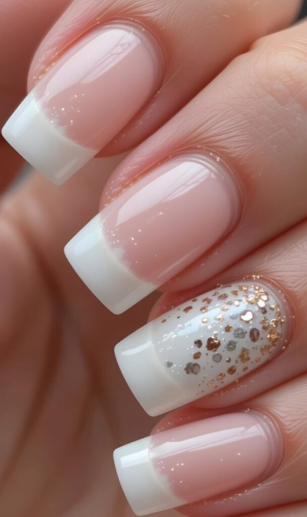 A soft pink base features white tips and one accent nail with gold glitter dots. The subtle sparkle adds a festive, radiant charm to the classic design.