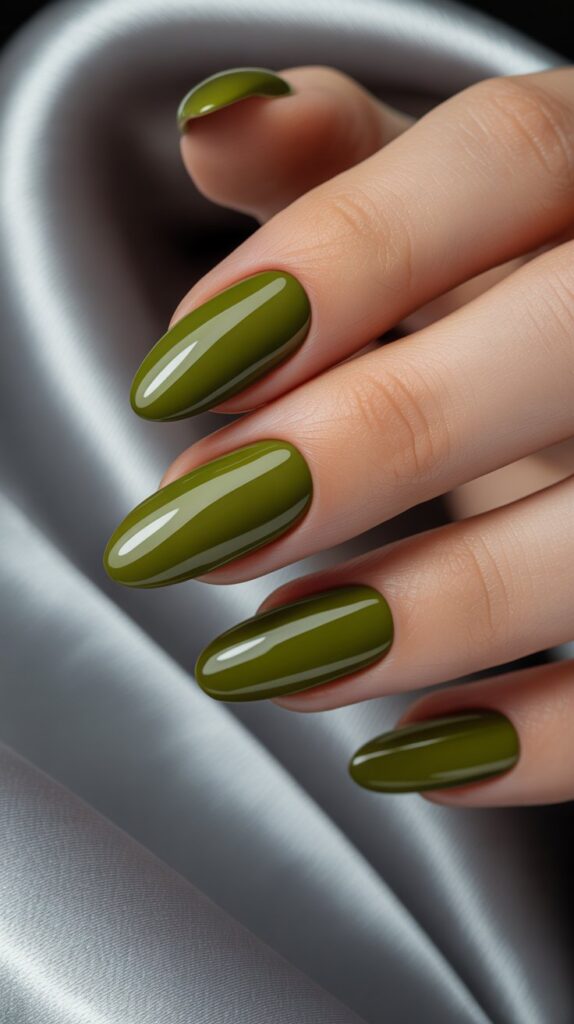 A rich olive green base features a high-shine finish that enhances the bold, earthy tone. The clean look adds a modern, elegant charm to the compact shape.