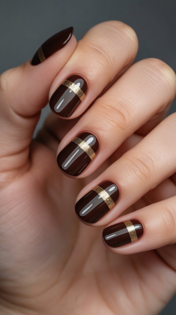 A rich brown base features thin gold stripes on each nail. The sleek detail adds a modern, luxurious touch to the classic palette.