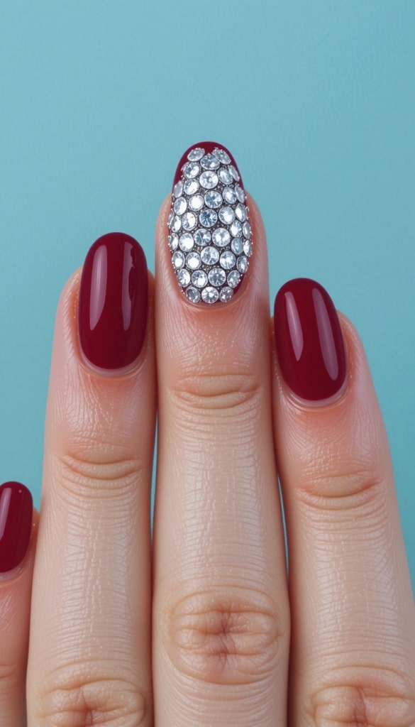 A deep burgundy base features one accent nail with a full rhinestone design. The glamorous detail adds a bold, elegant flair to the clean finish.