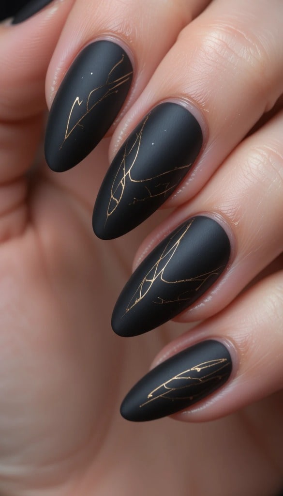 A sleek matte black base features delicate gold lines on each nail. The minimalist detail adds a modern, luxurious touch to the dark finish.