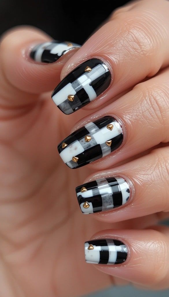 A black and white plaid base features gold studs on each nail. The bold pattern adds a modern, edgy touch to the clean, structured design.
