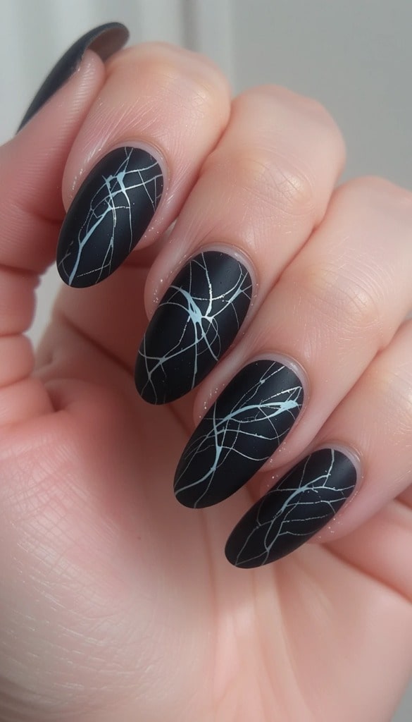 A sleek matte black base features white crackle lines that resemble shattered glass. The bold detail adds a modern, edgy flair to the minimalist design.