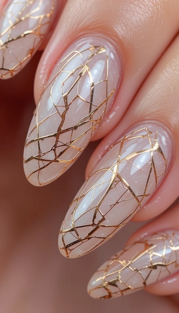 A soft nude base features gold geometric patterns that resemble cracked marble. The intricate design adds a glamorous, artistic flair to the clean shape.