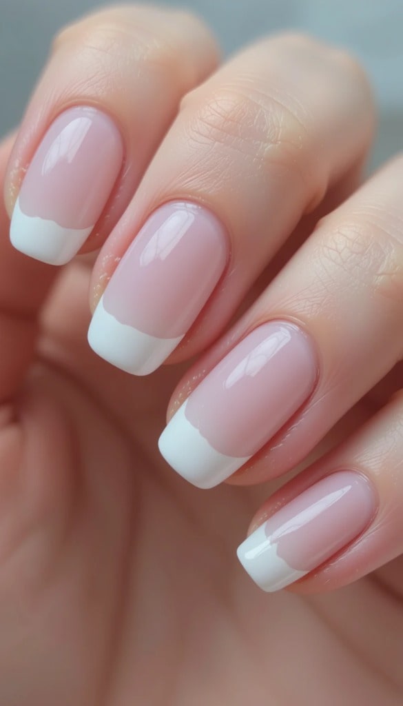 A soft pink base features white tips in a classic French style. The clean design adds a timeless, elegant charm to the compact shape.