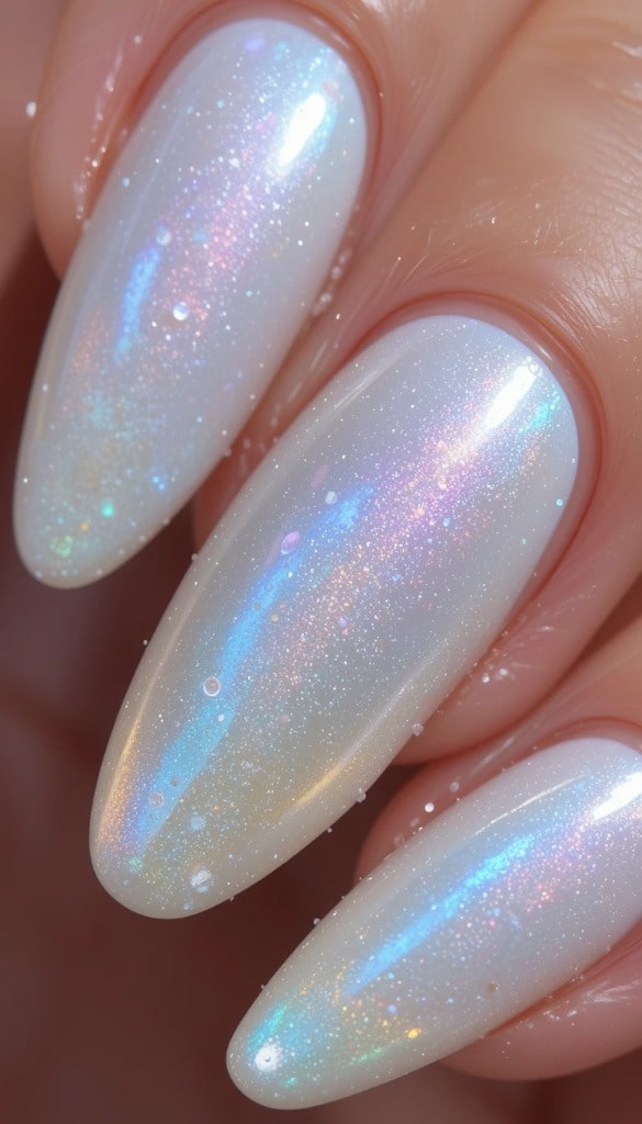 A soft white base features iridescent glitter that shimmers with rainbow hues. The delicate sparkle adds a dreamy, ethereal charm to the minimalist design.