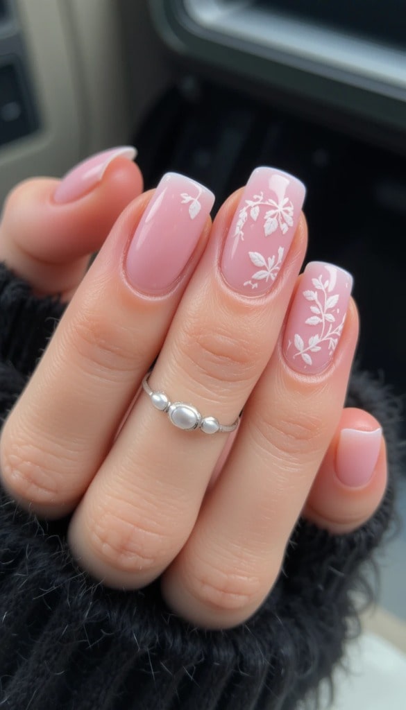A soft pink base features white leaf patterns on two nails. The delicate details add a feminine, natural charm to the clean finish.