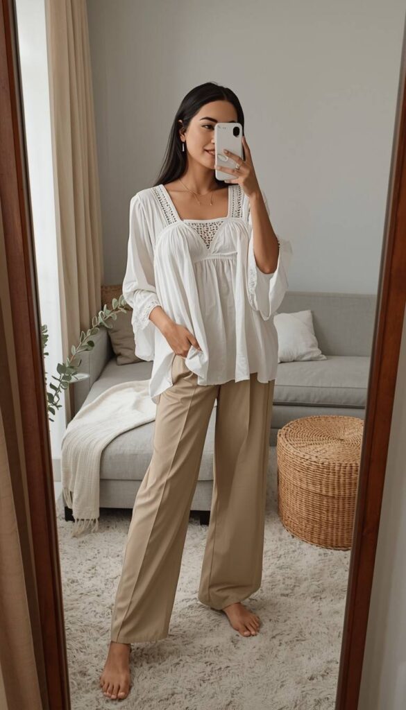 A white short-sleeve blouse with delicate eyelet lace trim at the square neckline and sleeve cuffs, paired with high-waisted beige wide-leg trousers (clean hem, subtle drape), styled barefoot on a plush ivory rug. The model takes a mirror selfie in a sunlit living room—grey sofa, woven ottoman, and greenery beside her, expression calm, smile gentle. The look is tender, refined, and deeply comforting—like a quiet Sunday morning made wearable.