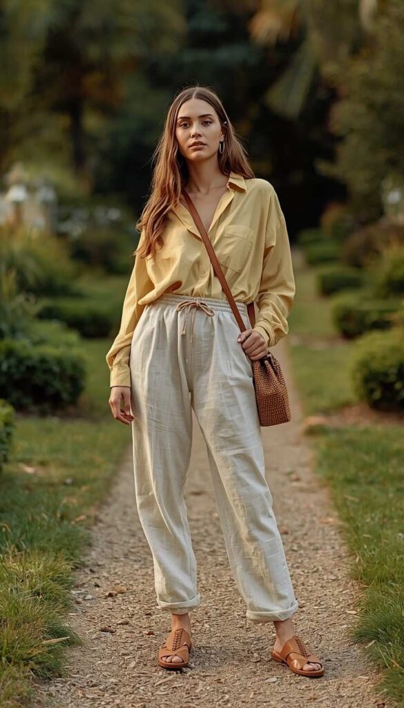 A soft mustard-yellow short-sleeve button-down shirt (V-neck, chest pocket) paired with high-waisted off-white drawstring-waist trousers (wide-leg cut, ankle-length), styled with tan leather slide sandals and a woven circular raffia tote. The model walks down a gravel garden path—greenery lush on both sides, sunlight filtering through leaves, expression peaceful and joyful. The palette is warm, cohesive, and full of gentle energy—summer ease, distilled to its purest form.
