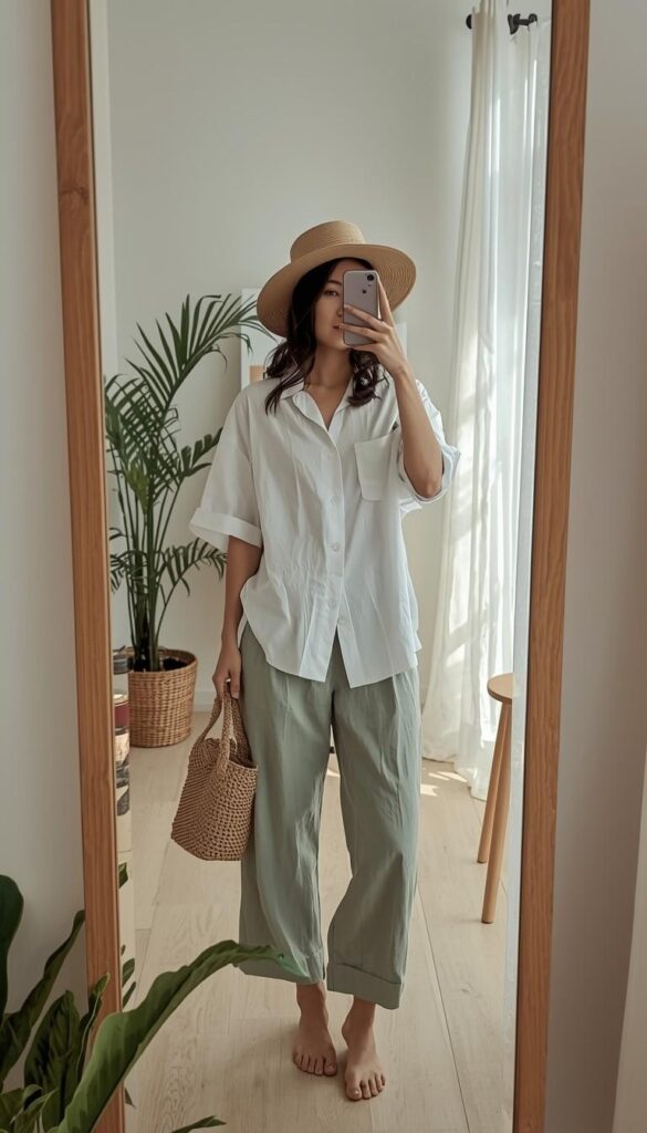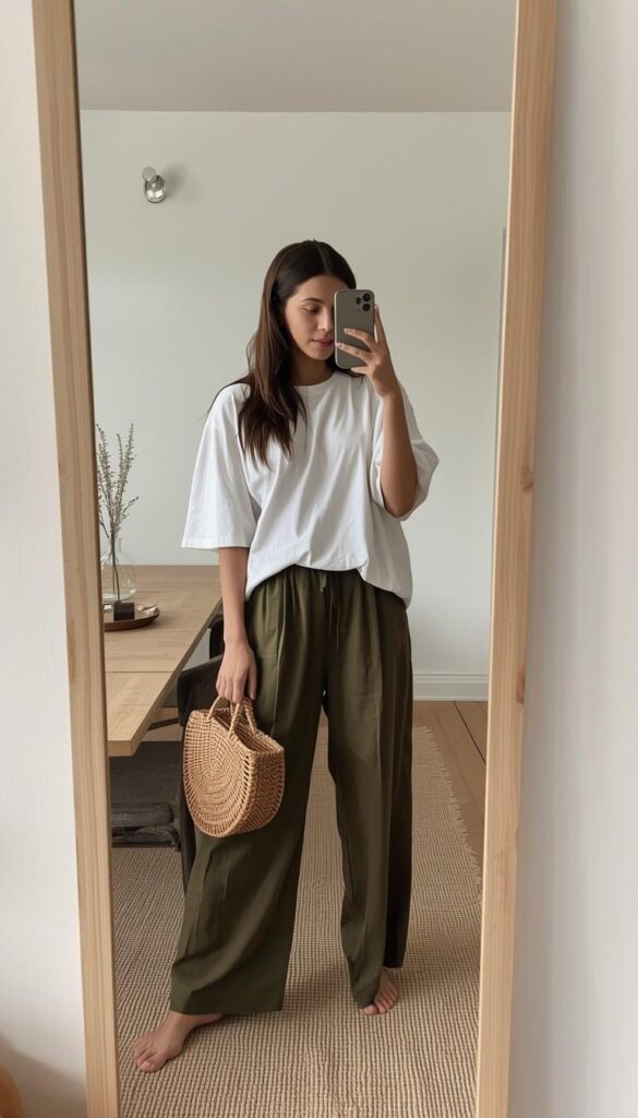A relaxed-fit white ribbed short-sleeve tee (round neckline, clean hem) paired with high-waisted olive-green wide-leg trousers (smooth drape, ankle-length), styled barefoot and holding a phone in a full-length mirror selfie. The setting is a minimalist interior—light wood floors, neutral tones, a woven rug beneath her feet. The silhouette is fluid, modern, and deeply grounding—comfort that doesn’t whisper; it resonates.