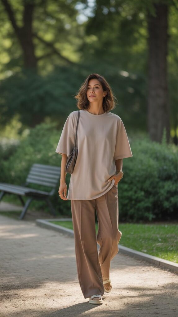 A beige oversized short-sleeve tee (Round-neck, soft drape) paired with high-waisted taupe wide-leg trousers (smooth texture, ankle-length), styled with white-and-tan slide sandals and a structured grey mini crossbody bag. The model walks down a tree-lined path—shadows cast by leaves, pavement cool beneath her feet, expression serene and unhurried. The look is relaxed, modern, and deeply confident—comfiness as quiet authority.