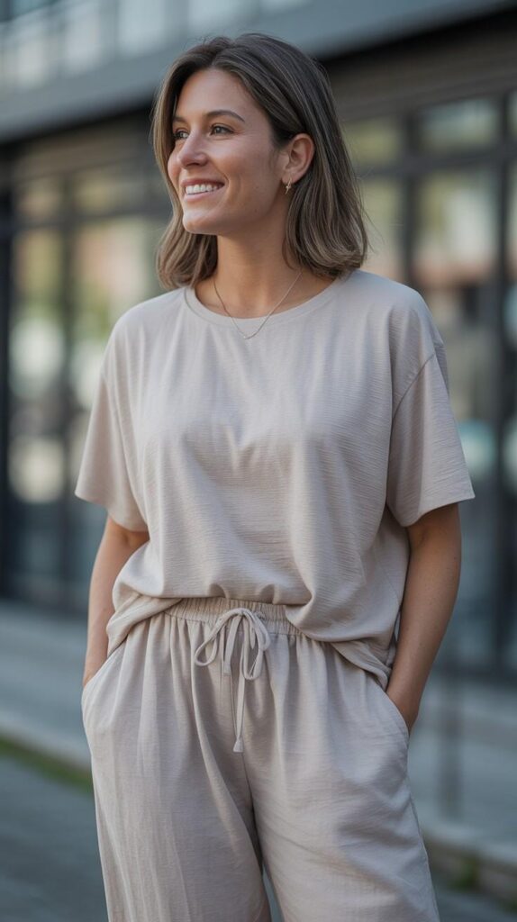 A muted beige short-sleeve ribbed knit top (V-neck, clean hem) paired with matching wide-leg jogger-style trousers (elastic waist, cuffed ankles), styled with tan leather slide sandals and a delicate gold pendant necklace. The model stands on a sun-dappled sidewalk—light filtering through trees, hair loose, smile gentle and genuine. The silhouette is fluid, cozy, and deeply grounding—home energy, worn outside the house.