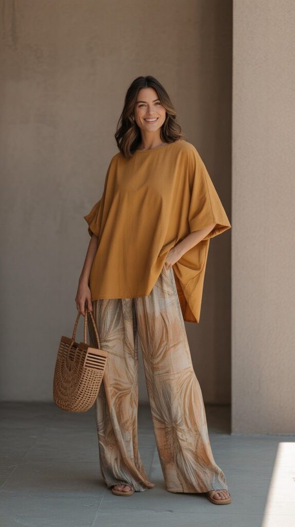 A bold mustard-yellow oversized tunic top (boxy cut, round neckline, clean hem) paired with wide-leg trousers in earthy abstract print (ochre, taupe, and ivory swirls), styled with tan espadrille sandals, a woven circular raffia tote, and delicate gold layering necklaces. The model stands in a sunlit courtyard—warm stucco walls and greenery behind her, smile warm and grounded. The palette is rich, cohesive, and full of quiet joy—comfort that commands attention.