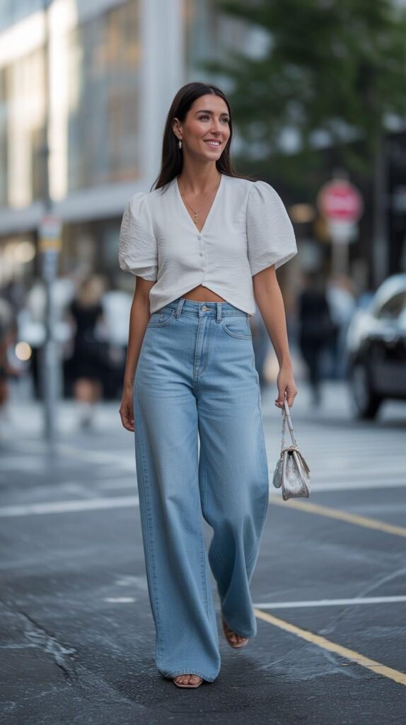 5) Puff-Sleeve Cropped Blouse & Wide-Leg Jeans