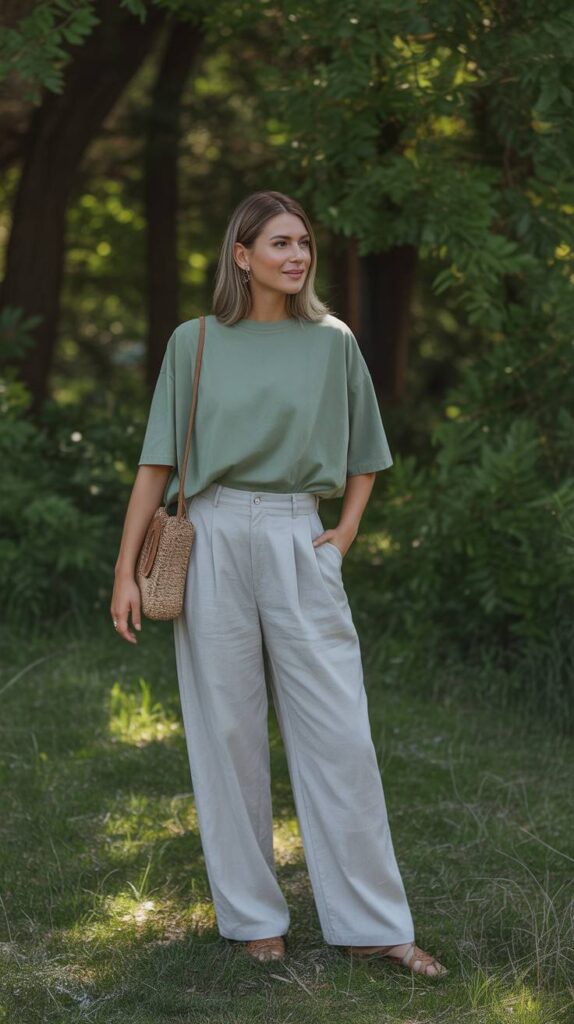 A muted sage-green short-sleeve tee (round neckline, clean hem) paired with high-waisted oat-colored wide-leg trousers (elastic waist, cuffed hems), styled with tan flat sandals and a delicate gold pendant necklace. The model stands on a grassy path lined with tall trees—sunlight filtering through leaves, hair softly windswept, smile gentle and assured. The silhouette is fluid, grounded, and full of quiet harmony—nature’s palette, worn with intention.