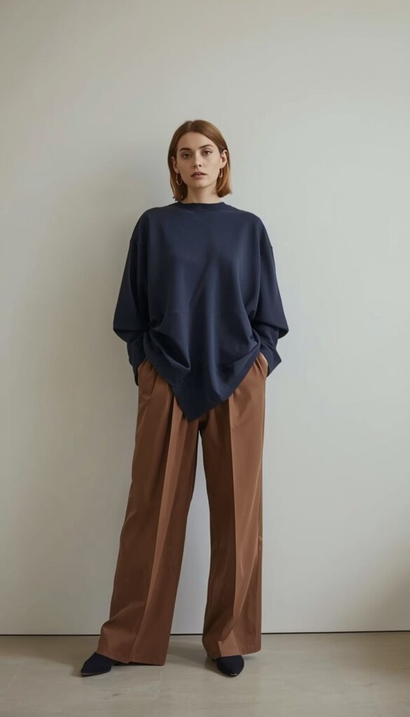 An oversized navy-blue boxy top (round neckline, relaxed drape) paired with high-waisted wide-leg taupe trousers (clean hem, subtle pleating), styled with dark navy pointed-toe loafers, delicate gold hoops, and a minimalist silver watch. The model stands against a neutral studio backdrop—light soft and even, hands in pockets, expression calm and centered. The palette is rich, grounded, and full of quiet sophistication—modern minimalism, reimagined for real life.