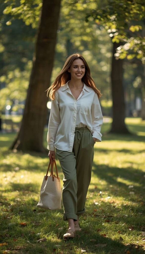 A crisp ivory button-down shirt (short sleeves, chest pocket) tucked into high-waisted olive-green wide-leg trousers (subtle pleating, ankle-length), styled with tan leather slide sandals and a small woven crossbody bag. The model walks through a sun-dappled park—green trees overhead, fallen leaves at her feet, expression calm and grounded. The look is fresh, practical, and deeply wearable—urban ease, rooted in nature.