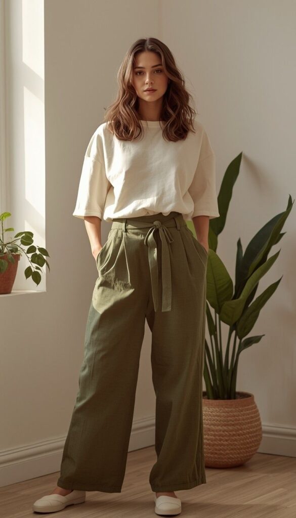 17) Minimalist White Tee & Olive Wide-Legs