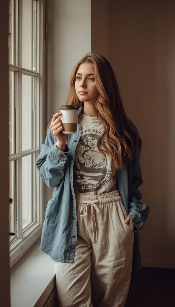 A vintage-inspired graphic tee (black-and-white illustration, cropped hem) layered under a light-wash denim shirt (long sleeves, rolled cuffs), paired with high-waisted oat jogger-style trousers (elastic waist, cuffed ankles), styled with tan espadrille sandals. The model stands beside a sunlit window—holding a coffee cup, hair loose, gaze thoughtful and serene. The look is nostalgic, relaxed, and deeply personal—comfort that tells a story.