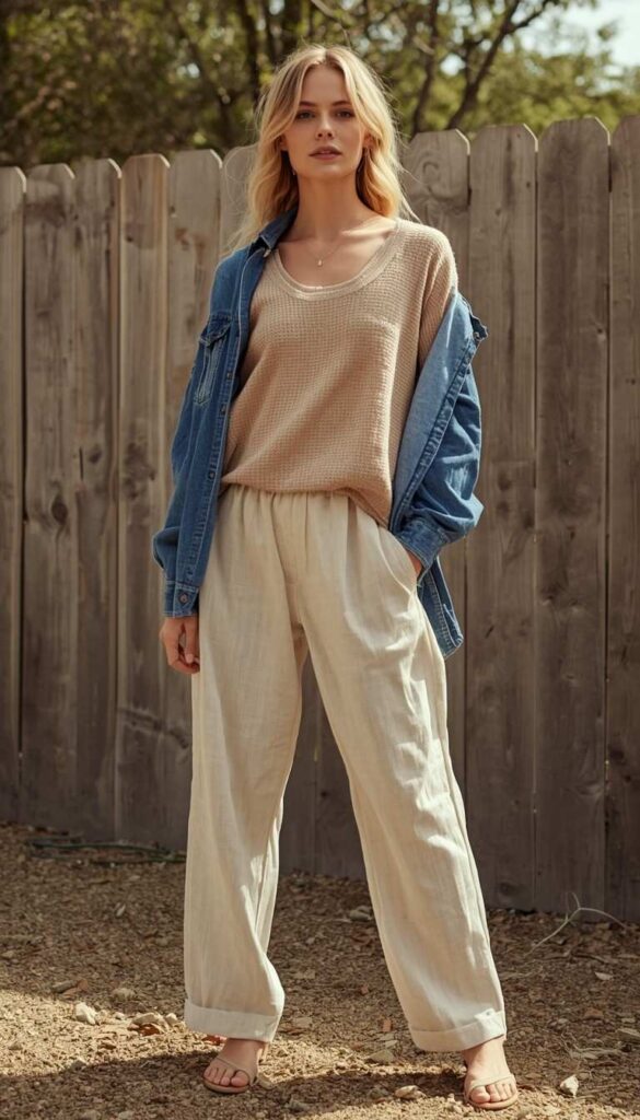 20) Waffle-Knit Layer & Linen Pants Against Rustic Fence