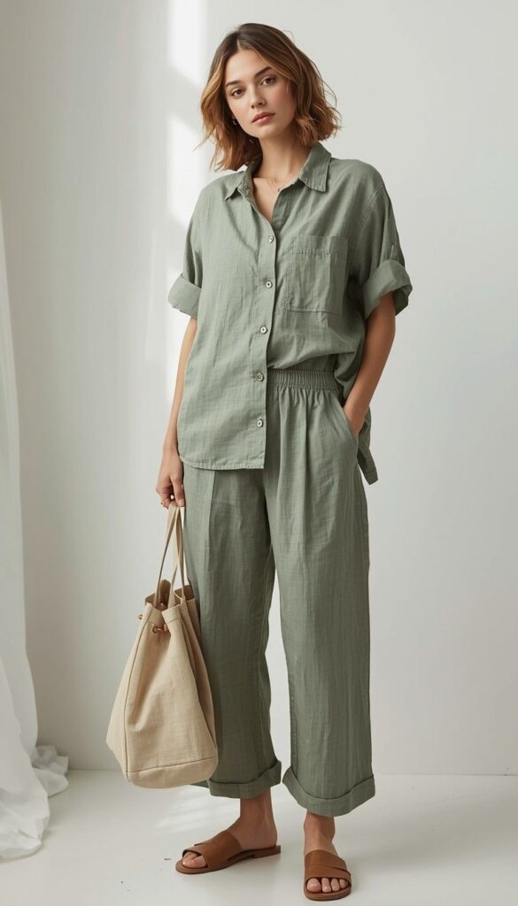 A short-sleeve sage-green linen shirt (notched collar, chest pocket, rolled sleeves) paired with matching high-waisted wide-leg trousers (cuffed ankles, subtle texture), styled with tan leather slide sandals and a structured beige canvas tote. The model stands in a minimalist studio—soft light streaming through sheer curtains, white walls, and a hint of draped fabric behind her. The look is quiet, cohesive, and deeply calming—like a deep breath made visible.