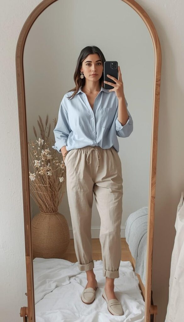 A light-blue short-sleeve chambray shirt (notched collar, chest pocket, rolled sleeves) tucked into high-waisted oat-colored wide-leg trousers (subtle pleating, cuffed hems), styled with tan leather slide sandals, a woven circular raffia tote, and delicate gold layering necklaces. The model stands in a sun-dappled home nook—dried floral arrangement in a woven vase, soft textiles, and warm light filtering through sheer curtains. The look is grounded, thoughtful, and full of quiet harmony—everyday comfort, elevated with care.
