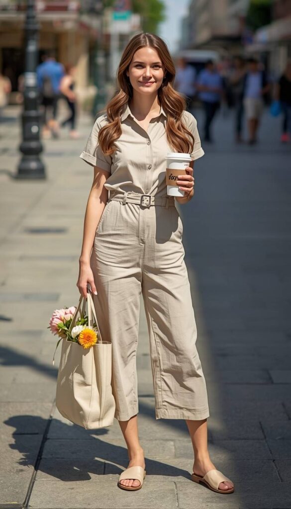 A high-waisted oat-colored utility jumpsuit (notched collar, front pockets, self-tie belt) styled with a small bouquet of fresh flowers tucked into the tote bag—paired with tan leather slide sandals and a beige canvas tote. The model walks down a sunlit city street—buildings blurred behind her, hair softly windswept, smile gentle and assured. The look is polished, practical, and deeply wearable: comfort with quiet authority.