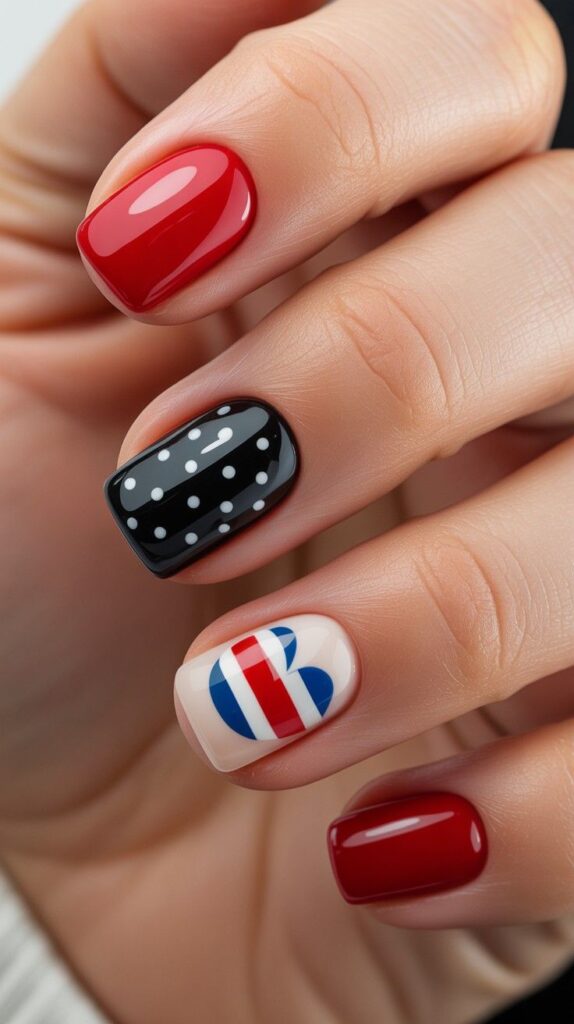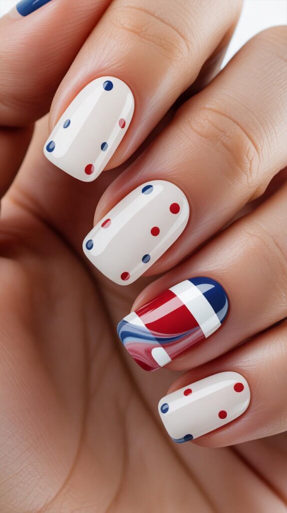 Clean white polish meets bold red and blue polka dots and flag design — modern, chic, and perfect for showing off your winter boots. The matte-to-glossy gradient adds depth, while the minimalist base lets the design shine. Paired with real snowflakes, this design whispers ‘minimalist magic’ with every step.