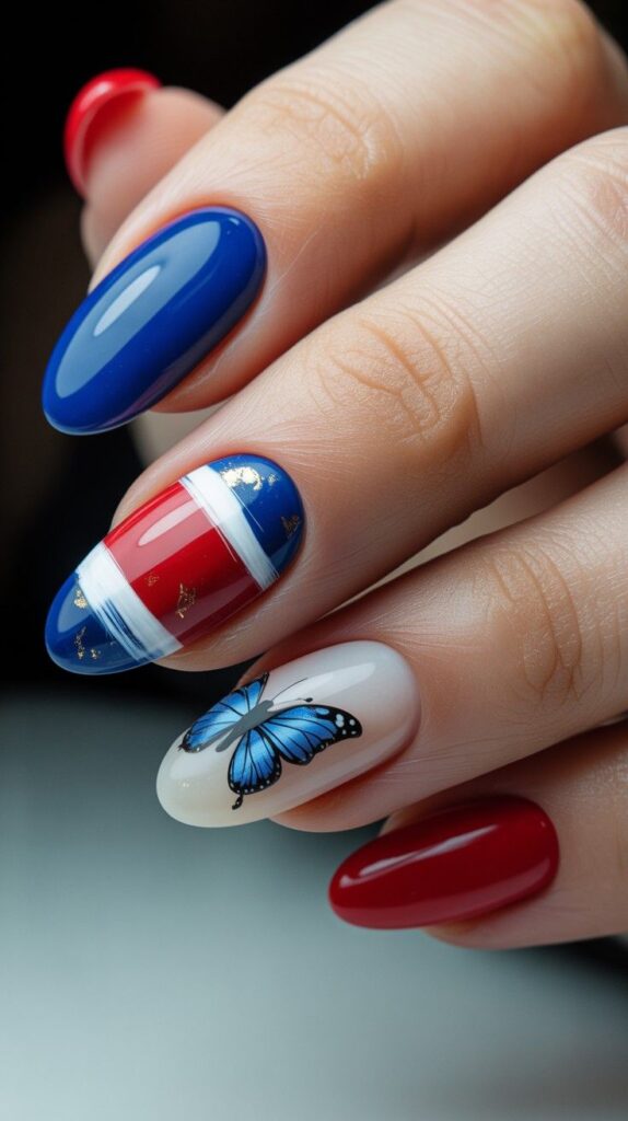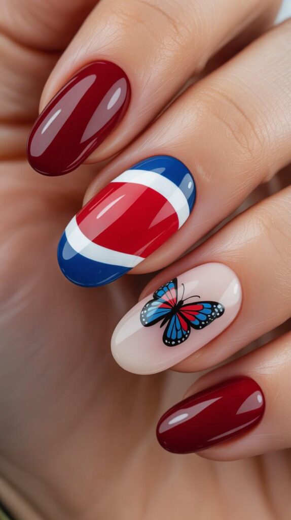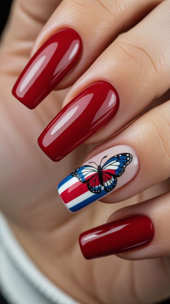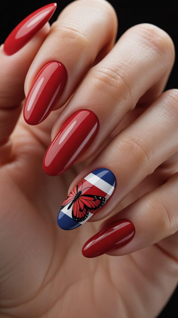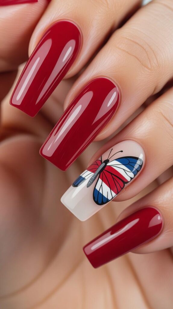 Rich glossy red coffin nails meet a single nude accent nail adorned with a hand-painted butterfly—its wings layered in Costa Rica’s iconic blue, white, and red. The contrast is bold yet balanced: vibrant patriotism meets delicate artistry. The high-shine finish makes the colors pop like sunlight on tropical wings, while the sleek shape keeps it modern and wearable.