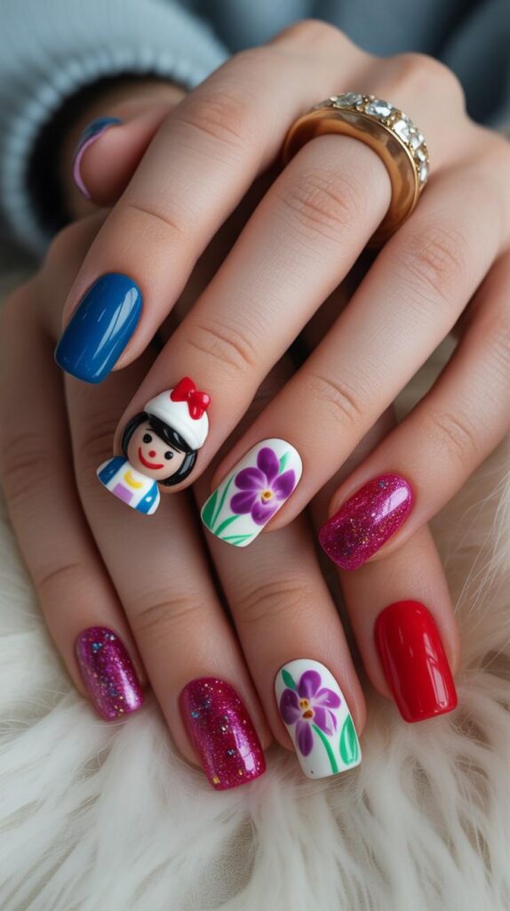 Clean blue polish meets bold glitter flowers and doll accent — playful, romantic, and perfect for showing off your engagement ring. The glossy finish makes it pop without overpowering your look, while the sharp stiletto shape elongates the fingers. Paired with a cozy knit sweater, this design whispers ‘festive glam’ with every step.